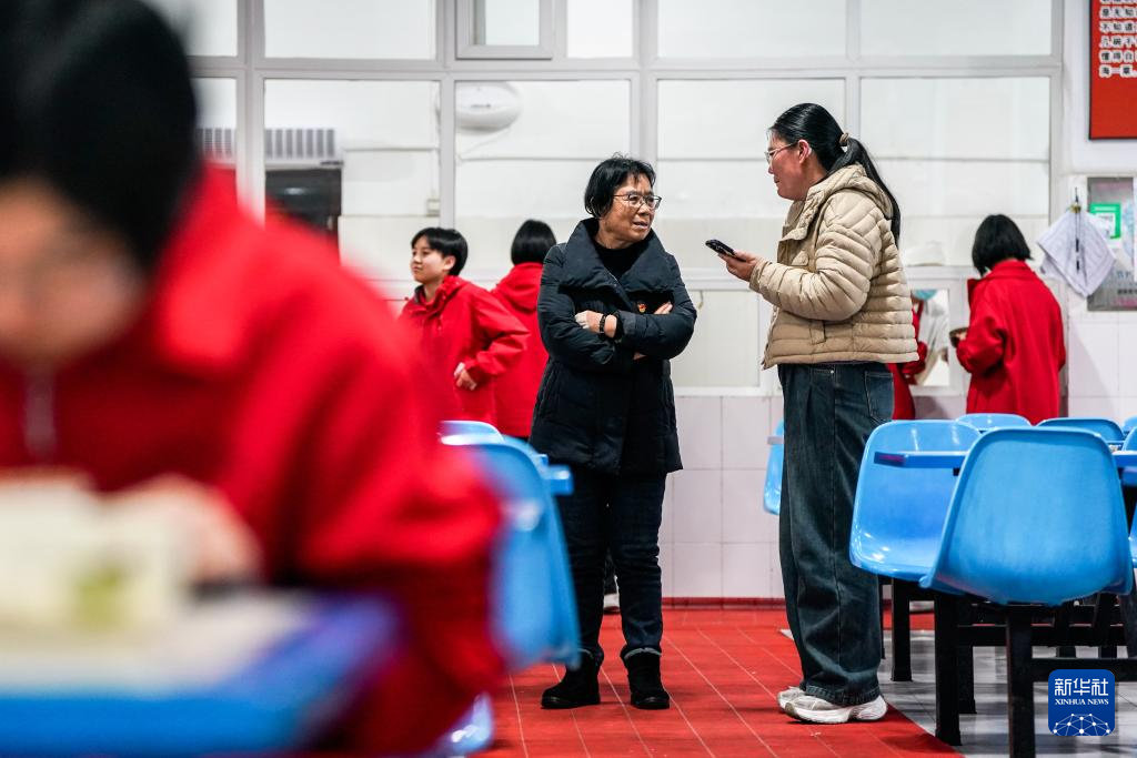 12月12日,張桂梅在華坪女高食堂和排隊(duì)的學(xué)生聊天。