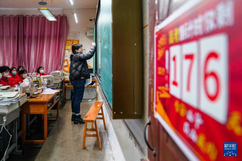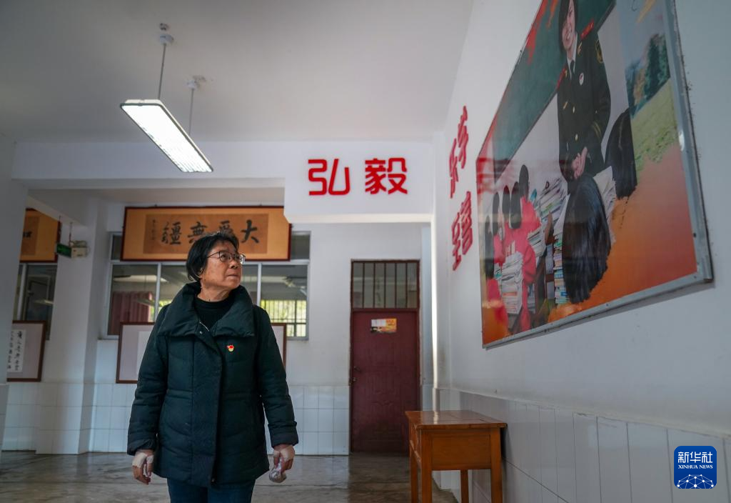 12月12日,在華坪女高教學(xué)樓,張桂梅從丁王英的照片前走過(guò)時(shí)駐足凝望。來(lái)自華坪通達(dá)傈僳族鄉(xiāng)的畢業(yè)生丁王英,2021年申請(qǐng)赴西藏部隊(duì)服役,在她的帶動(dòng)下,家鄉(xiāng)村寨已有十余名青年相繼參軍。女高教學(xué)樓一樓的丁王英照片,成了女孩們每日途經(jīng)時(shí)的精神激勵(lì)。